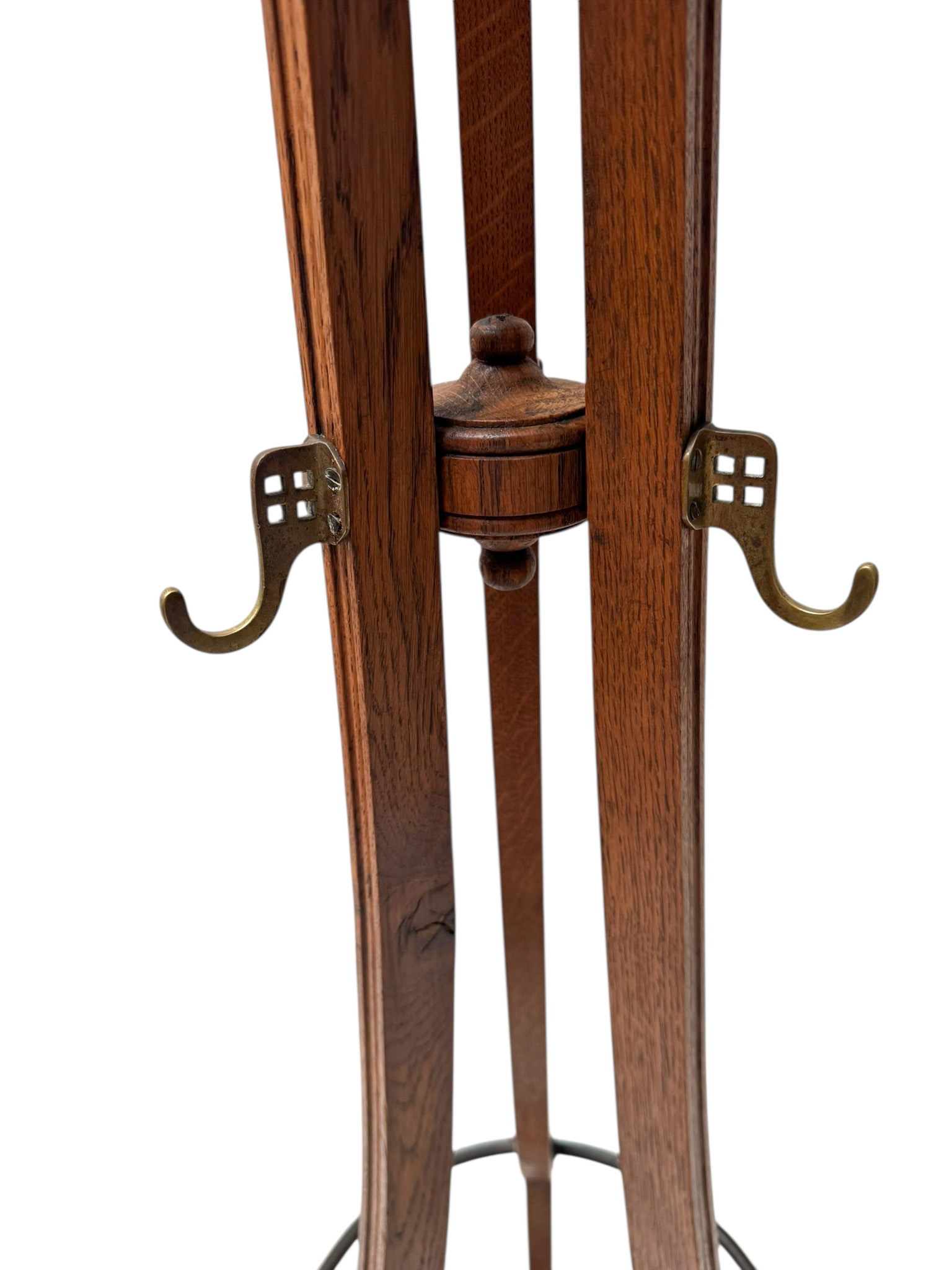 Magnificent and rare Arts & Crafts coat stand or porte manteau. Striking Dutch design from the 1900s. Solid oak frame with original rotating top. Seven original Arts & Crafts patinated brass hooks. With integrated brass rings and drip section for umbrellas. This wonderful Arts & Crafts coat stand or porte manteau with rotating top is in very good original condition with minor wear consistent with age and use, preserving a beautiful patina. A real eye-catcher for your home or office. We will ship this lovely piece in a custom made wooden crate for safe transport when purchased by overseas buyers! Our gallery is a family-owned and managed company which has been dedicated to dealing in 20th century Decorative Arts since it’s foundation in the late 1920s. We supply customers around the world from our headquarters in Amsterdam and our new showroom in Cruquius near Amsterdam Schiphol Airport. We ship worldwide and our team of experienced packers will wrap and pack your item carefully. Please note that overseas shipping is with FedEx and front door only!